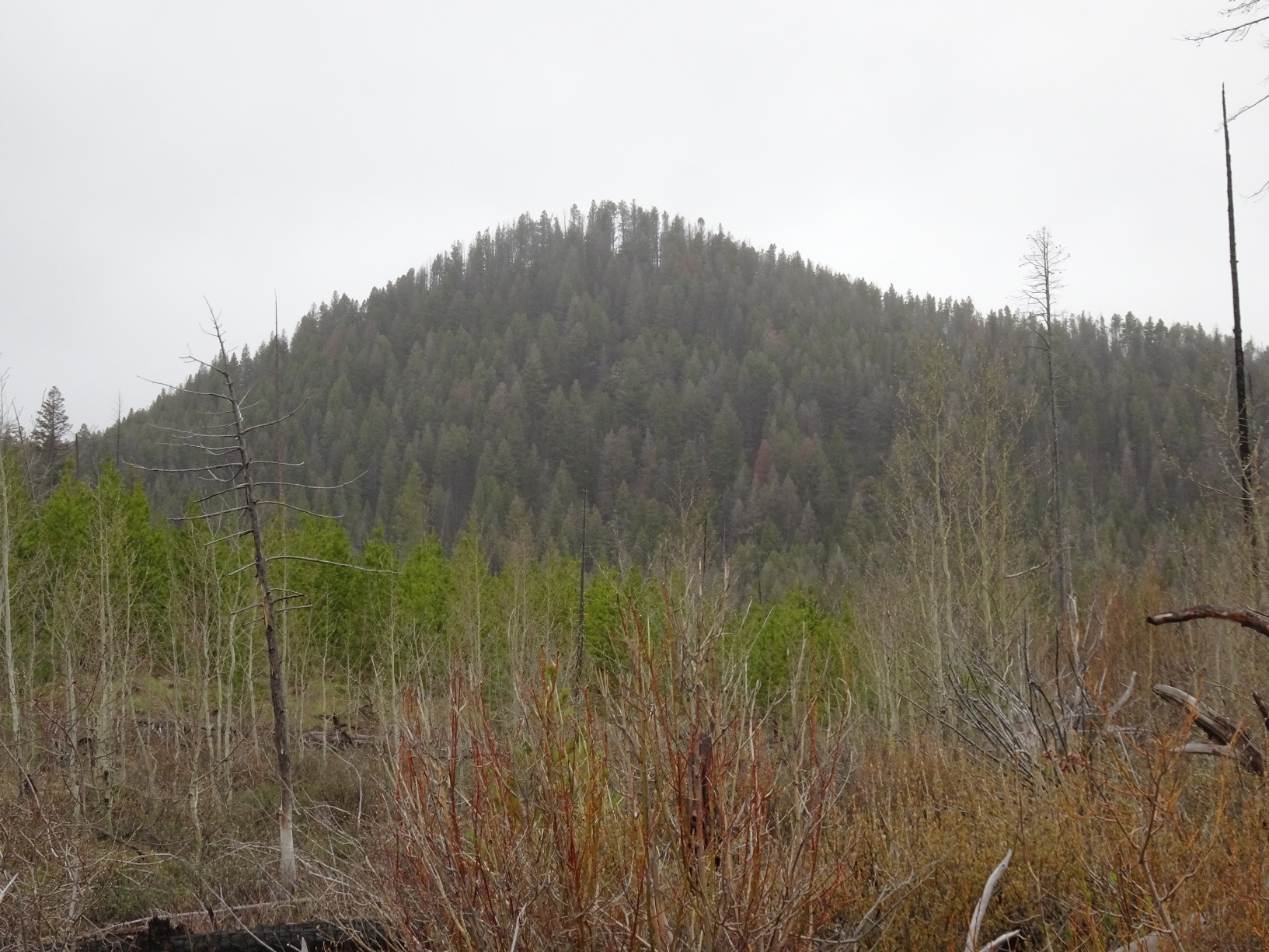 This is a good early-season summit. Had north on Tr. 481 (The Heart Lake Trail) from the Indian Meadows Trailhead northeast of Lincoln. The trail will soon cross a swale/ephemeral creek that comes in from the left just before the trail swings right and climbs to a low pass. Bushwack up the right (north) side of this drainage and then head directly up to the summit. The hike is a fairly easy bushwack with some deadfall and regen from the 1988 Canyon Creek fire. The summit is forested. It is in Grizzly country, so take appropriate precautions (carry bear spray & make noise).Peak 6333