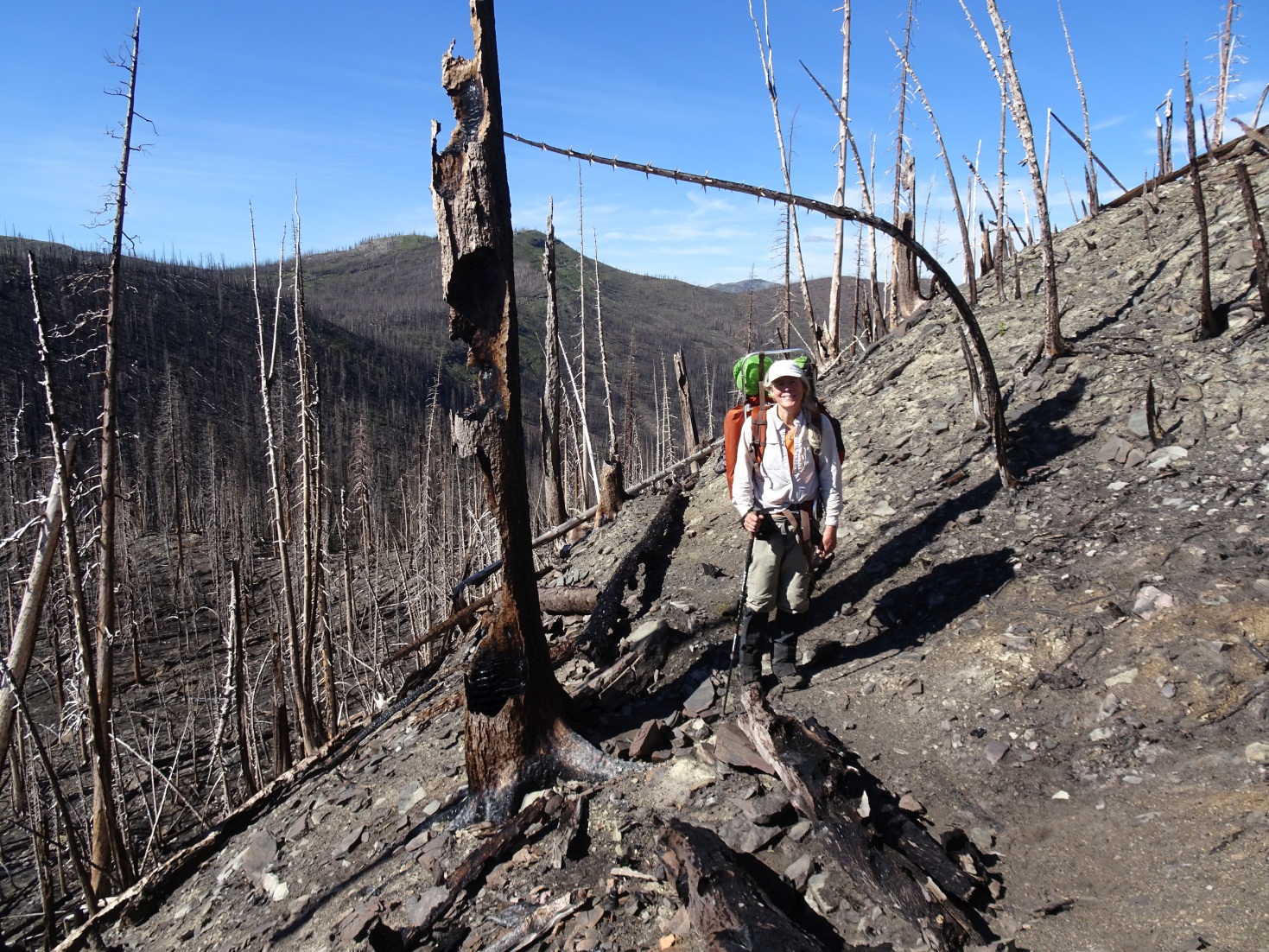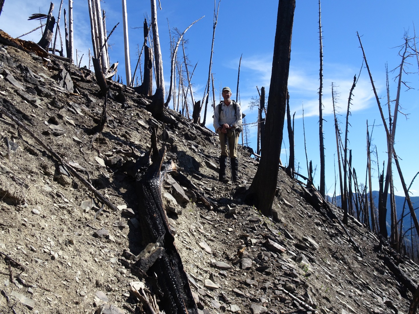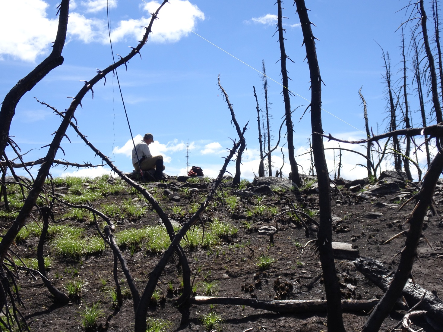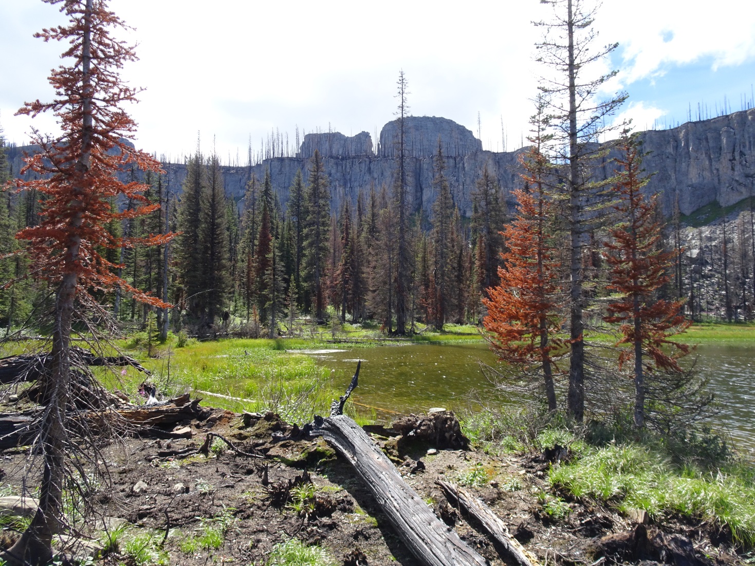 Hike 0.72 miles from the Silvertip Trailhead to the Dean Ridge trail. Take the Dean Ridge trail up to near the ridgetop. The trail enters the 2015 Trail Creek burn just before the crest of the ridge. The burn made for rough going in 2016 – it appeared that we were the first to pass through. There was lots of deadfall and the trail was extremely difficult to find and follow in several locations. Follow the trail to the saddle near Gunsight Peak and ascend off trail to the summit. There is little camping along the route, although it should be possible to camp near Gunsight Lake. Gunsight Lake is also in the burn but there are some spots that are less burnt than others. Watch out for “standing dead” – especially if it is windy. Gunsight Lake is below the aptly named “Gunsight Rock”.