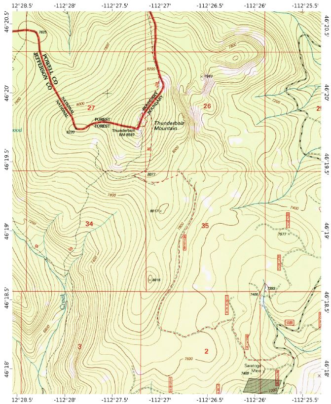 From the I-15 Bernice exit (west of Basin), follow the Boulder River road 3(ish) miles and turn right, cross the river, and continue for another 3(ish) miles to FS-1588. Turn right (north) on FS-1588, a well maintained gravel USFS road. Follow FS-1588 for 6(ish) miles as it skirts the west side of the Red Rock Creek basin. Park at the Saratoga Campground on the right side of the road. Begin the hike by following the 2-track that heads northwest from just north of the cattle guard. Follow the 2-track for about 1-mile and turn sharply to the left at the “T”, staying on the most traveled road. Continue following the 2-track as it winds about, eventually heading north towards Thunderbolt Mountain. After another 2(ish) miles, the 2-track will be mostly blocked, and a foot trail will depart directly up the hill to the left. This junction is marked by a “snowmobiles only” sign. Follow the foot trail as it ascends west to the crest of the north-south trending ridge. The path will fade in spots, but is delineated by periodic blazes and cairns. Upon reaching the crest of the ridge, the path becomes very obvious and is marked with blue reflectors. Follow it as it continues north and eventually descends a bit (50’ – 100’) down the west side before ending at a “T-Junction” on the steeper north slope of Thunderbolt Mountain. Turn right on the well-marked trail (CDT-trail) and follow it as it gently spirals up around the east side of the mountain. Upon reaching the north side of the mountain, the trail will reach another junction – continue up to the summit. Note that the true summit is further north than the first rocky pile that the trail passes. The summit includes the burnt remains of a 1930’s vintage R-4 lookout that used to be perched on 40-foot poles. It was destroyed in 1965. The summit offers scenic 360-degree views.