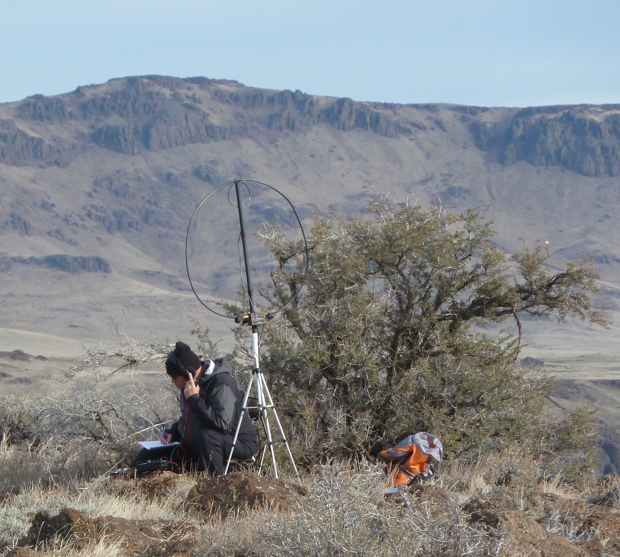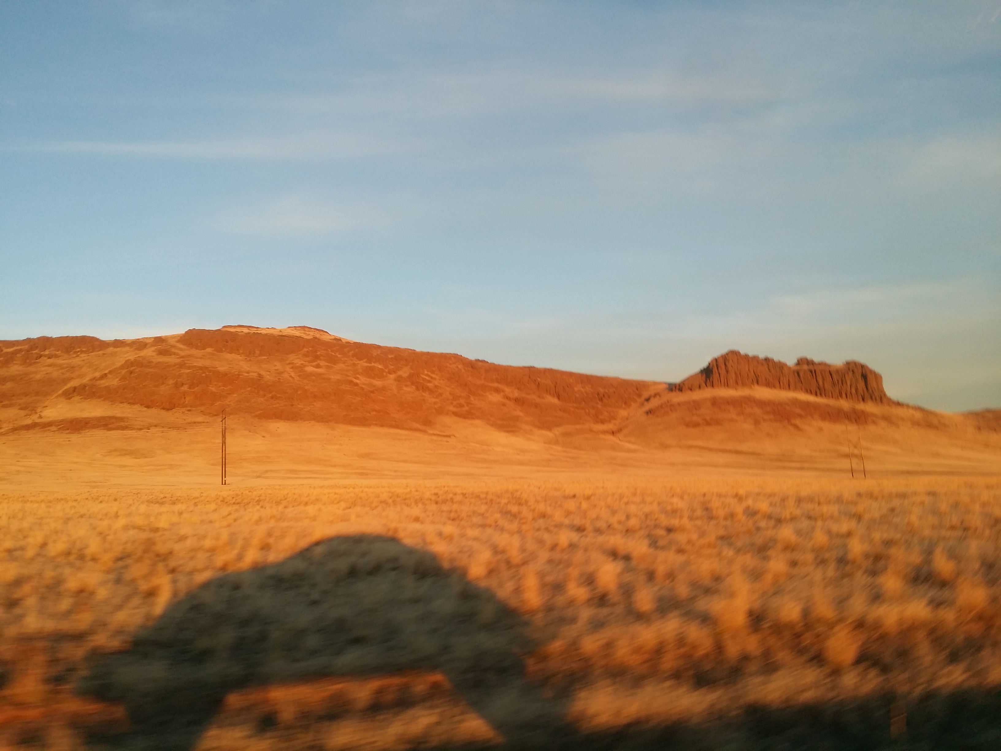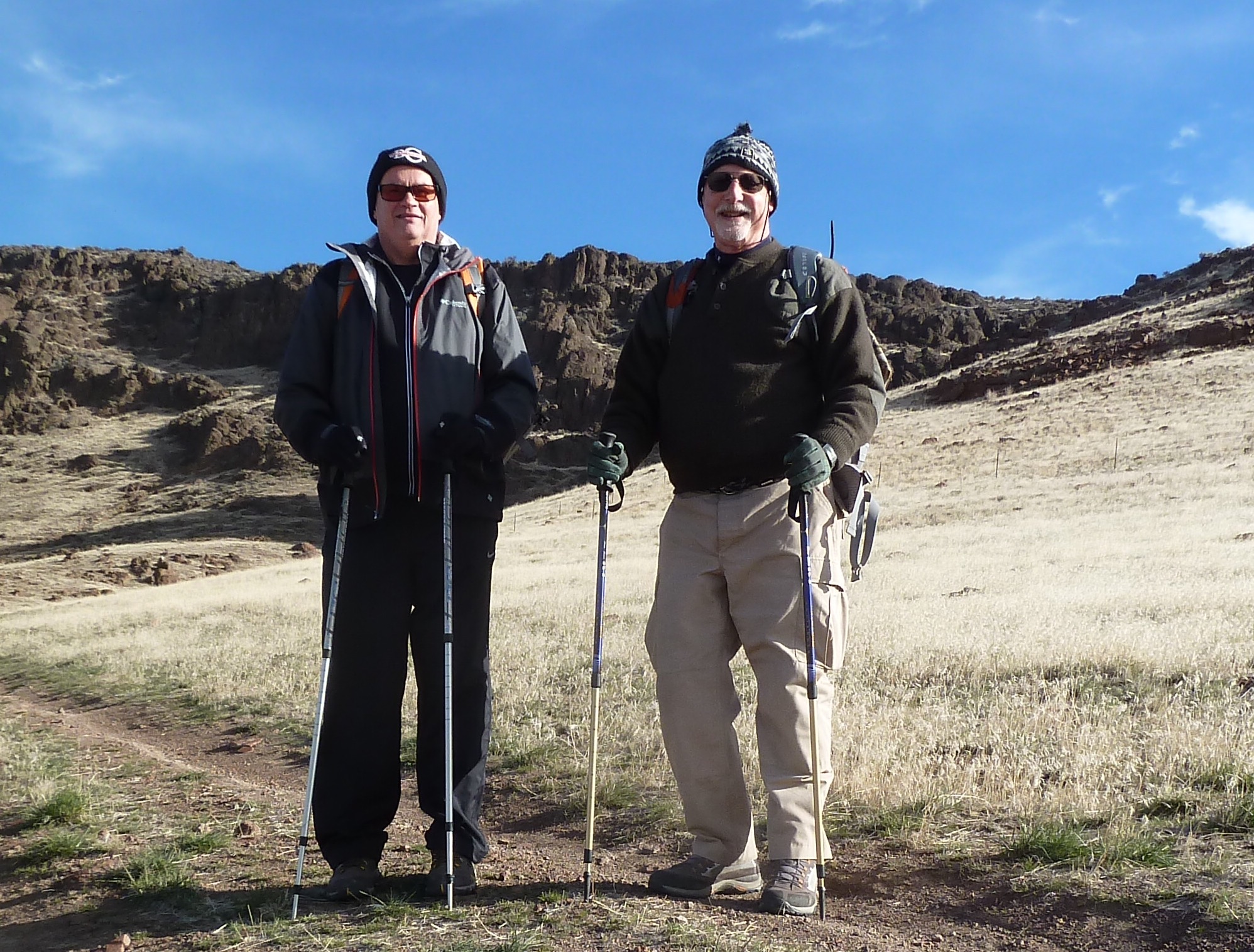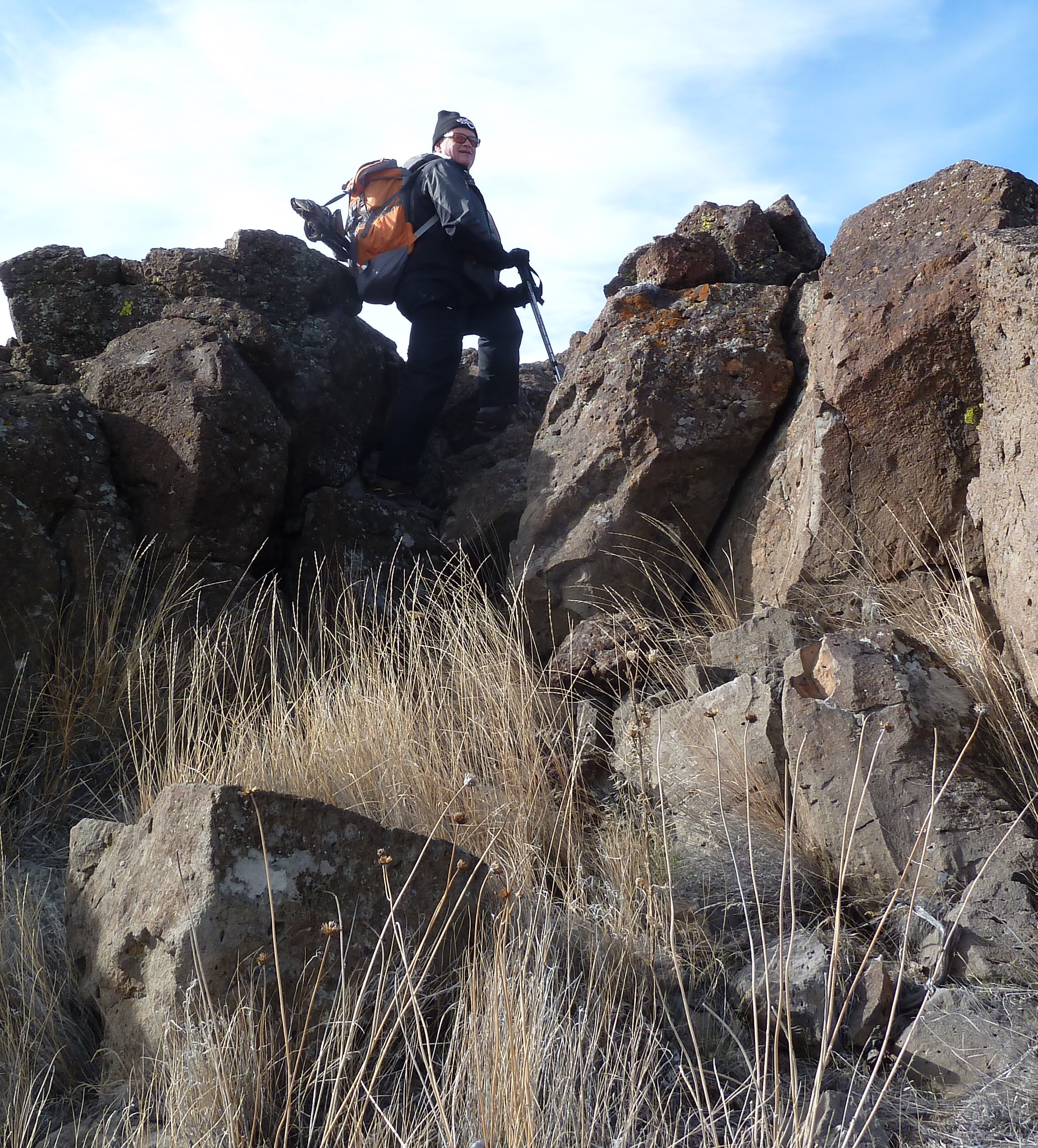 Getting there: From I-84 Freeway go north on Highway 20, 7.1 miles to Teapot Road (dirt road). East on Teapot Road 2.4 miles to spur road toward base of cliff. On the spur road, travel about .1 mile near the base of Teapot Dome toward a fence. Park in a cleared area that is free from tall grass to prevent rangeland fire. And park away from cattle trough, so cattle can get freely access their water. FYI, in photographs KC8WF is wearing a dark grey jacket with black pants and I am wearing a olive sweater or red wind breaker with tan pants.