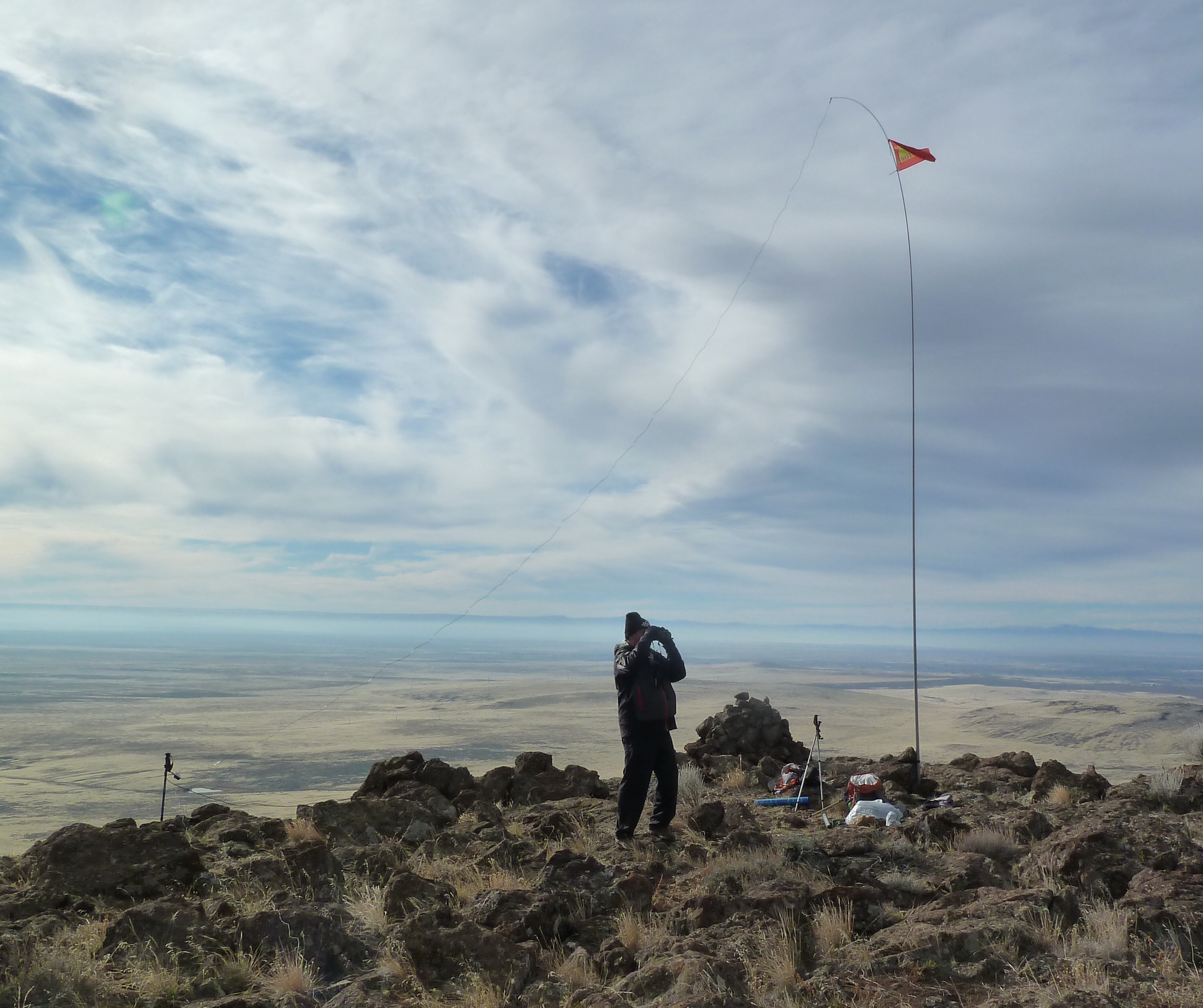 Once upon the summit we found a geocache, explored the views with binoculars, set up our antennas, and connected our KX3 radios. The summit is a flat top about 75 yards by 35 yards in size with rock/boulders and three small bushes capable to secure a mast. We had 10 to 15 mph wind with an increasing overcast cloud cover over the summit. I used a 10 meter / 32.8 foot mast with 35.5 foot wire and 9:1 unun sloping to the east. KC8WF used an Alex Loop antenna. I incorrectly used email from my DeLorme InReach (Iriduim) to self-spot, which failed to send. My second SOTA Chaser, W7RV placed activation spot for me. Thank you W7RV! After that a pile up began for me. KC8WF used his AT&T cellular phone with LTE signal with 3 bars to self spot on top of Teapot Dome. Sloper wire antenna from mast seemed to be receiving and transmitting better than the loop antenna. We both had successful SOTA communications throughout the United States with 10 watts. My brother (KB6CIO) / my SOTA elmer too, was monitoring our first Idaho SOTA communications from California. Unable to clearly contact us on HF, KB6CIO sent a text message to my DeLorme InReach with excitement and congratulations of hearing our chasers and our success.